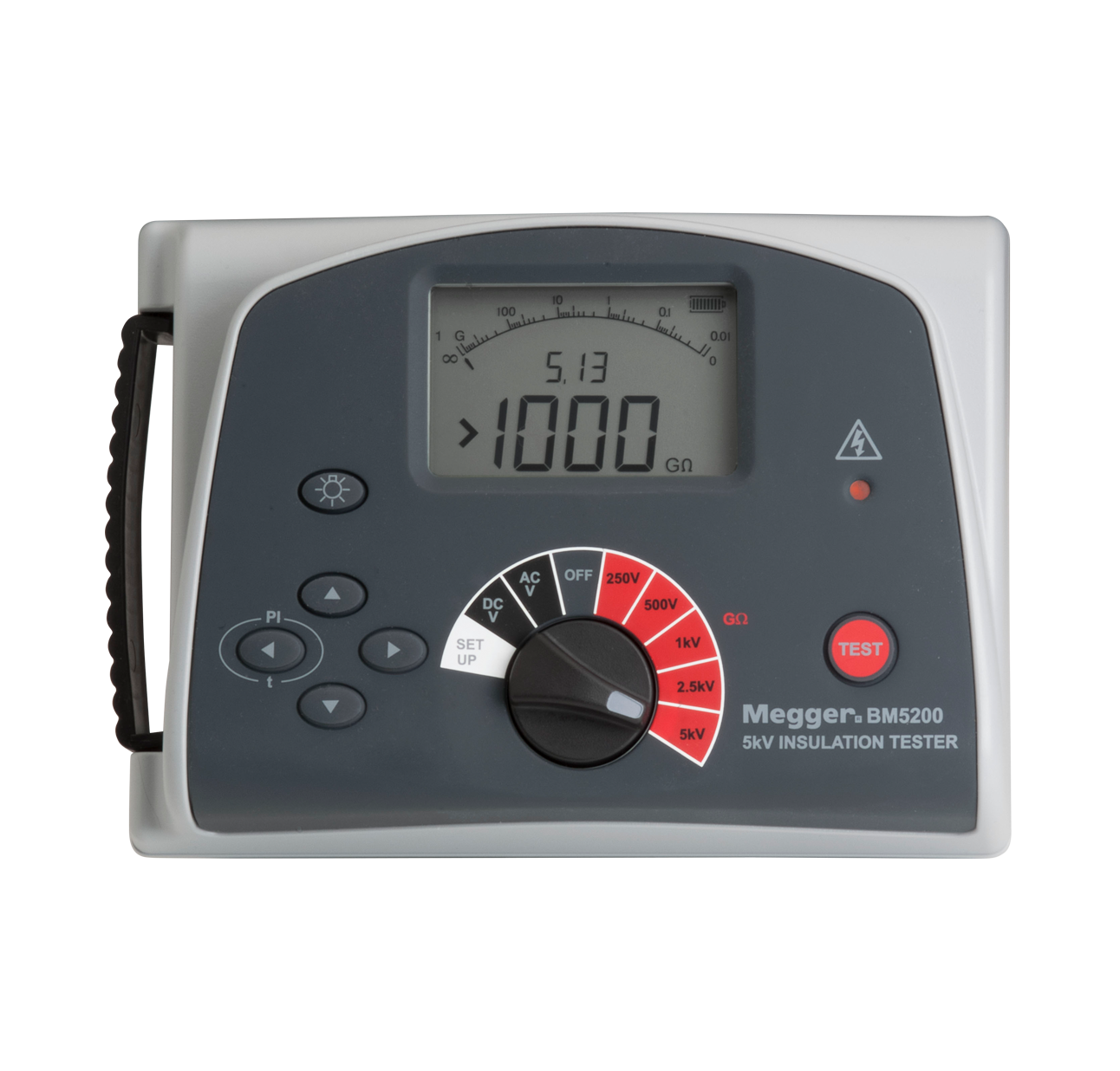 Megger BM5200 5k Insulation Tester, Digital/Analog Display, 100GΩ, CATIII 600V is specifically engineered for conducting high voltage insulation resistance assessments during the maintenance and servicing of cables, rotating machinery, transformers, switchgear, and various industrial applications.